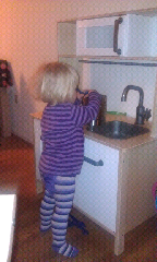 Elina fik et køkken i julegave af hendes søde forældre 🙂 Det er nu samlet og er et hit. Så nu må moderen i gang med at hækle noget mad til køkkenet…