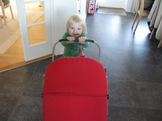 Frem med dukkerne, dukketøjet, bleerne og sutteflaskerne- hun ser allerede ud til at nyde hendes nye køretøj:-)